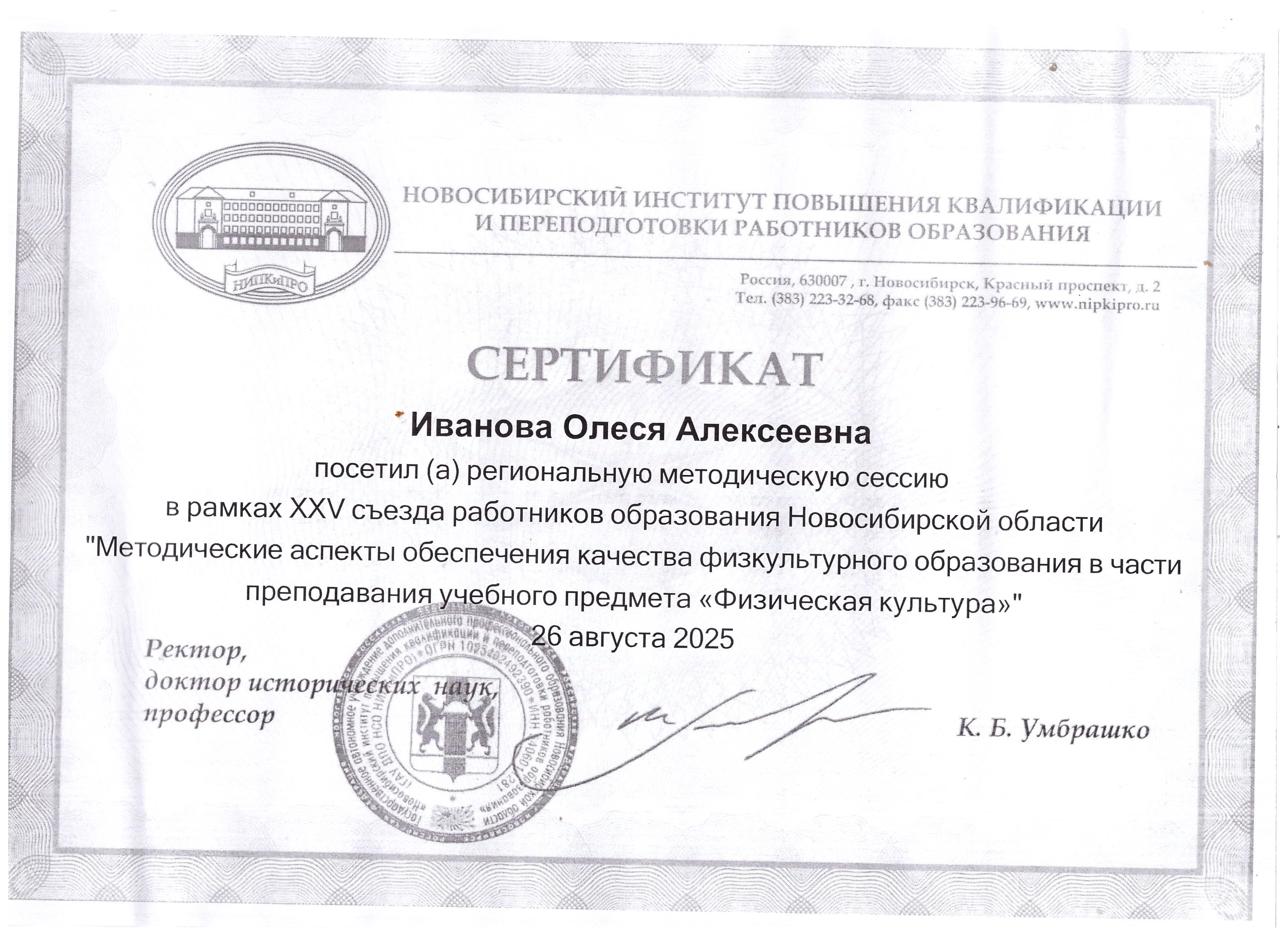 Сертификат за участие в региональной методической сессии в рамках XXV съезда работников образования Новосибирской области "Методические аспекты обеспечения качества физкультурного образования в части преподавания учебного предмета "Физическая культура" (август,2025)