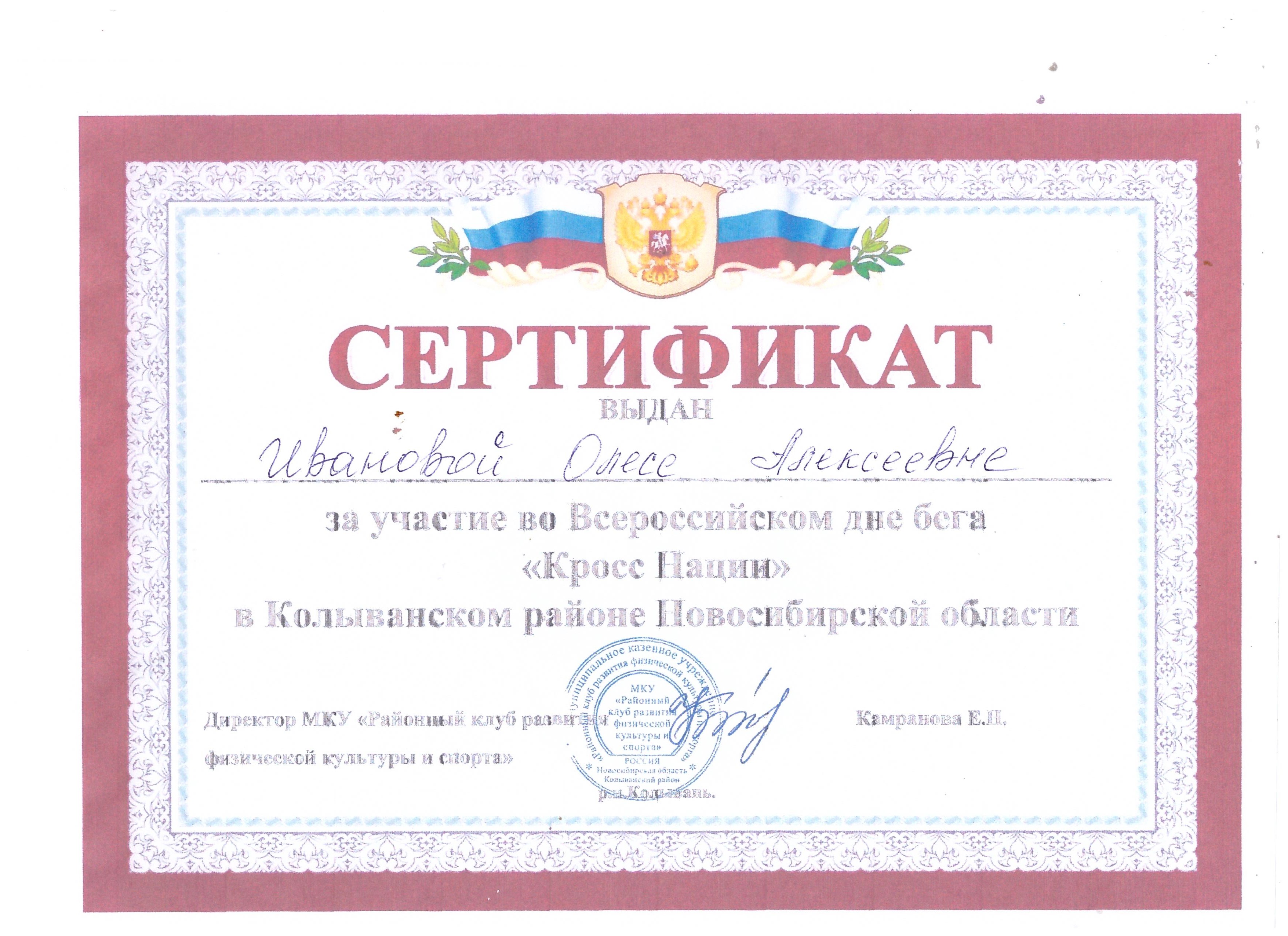 Сертификат за участие в спортивном празднике среди педагогов дошкольных учреждений Колыванского района НСО "Будь здоров, педагог!"